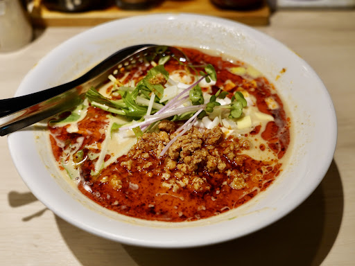 Read more仕事の関係で近くのホテルに宿泊していたので、夕ご飯にと訪問。 平日、7時過ぎ頃に伺いましたが、並びは1名ほどでしたが 私が並びだして数分後には後に2~3組並び始めていました。 並んでいる間に、メニューを渡していただき、オーダーと紙エプロンは必要か等を聞いてくださりました。 今回は坦々つけ麺をオーダーしたのですが、麺の茹で上がりに時間がかかるとの事で、席が空く前に準備をしてくださるとの事。