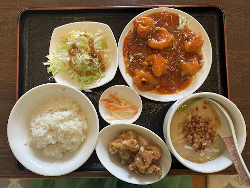 日替わりランチを頼みましたが、 数種類から選べるメイン・揚げ物・サラダ・スープ・ゴハン。 選べるメインでエビチリを頼みましたが、量もしっかりあり、満足しました。 揚げ物は鶏の唐揚げで、中華料理特有の大きい唐揚げが2個も付いていました。