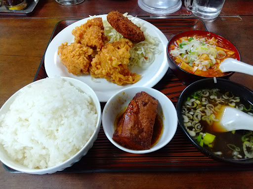 で、そのボリュームは、、、 評判通り! メインは大きな鶏の唐揚げが3つにメンチカツ、添えてあるキャベツも山盛りです。そこにこれまた大きな豚の角煮。これもホロホロ崩れるくらい柔らかく煮込まれています。それだけでなく、おわんいっぱいのマーボー豆腐までついてきます! これだけでメインを張れるぐらいの量と味。半分はごはんにかけて頂きました。そのごはんも並盛とは思えない量で、大盛りにしなくて正解でした! そしてスープも付き、これで950円は破格です! もった早く来れば良かったです。これはリピート確定です。