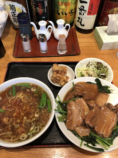 Read more平日11時30分頃訪問。 店内はカウンター席、テーブル席、座敷です。 まだ、お客さんはあまり見えませんでしたが、昼時になると続々と来店してきます‼️ 常連さん?が多く見られる感じてした。 お昼のセットメニューの角煮飯セット1080円を注文🎵 角煮飯、シンチャンラーメンor台湾らーめん、揚げ物、サラダが付いてきます✨ 角煮飯はボリュームが凄い‼️ とにかく分厚く切られた豚の角煮が柔らかくて美味しい✨ 醤油ベースのあんがしっかり染み込んでいて、箸で簡単に解れてしまうほど柔らかい‼️ 脂身も甘くて美味しい✨ 角煮飯だけでも十分なボリュームです✨ 台湾らーめんも辛さ控え目で美味しい✨ 独特な香辛料の味と風味はしますが、醤油のマイルドな味わいで旨い😋 揚げ物の唐揚げも美味しいです😁 とにかくボリューム満点でガッツリ系にはオススメです‼️ 店員さんも明るく親切丁寧な対応でした。 口コミで、男性?店員さんの評判があまり良く書かれていませんでしたが、然程気になる様や感じではありませんでした。時間帯(混雑時)によっては、そう感じるのかもしれません😅