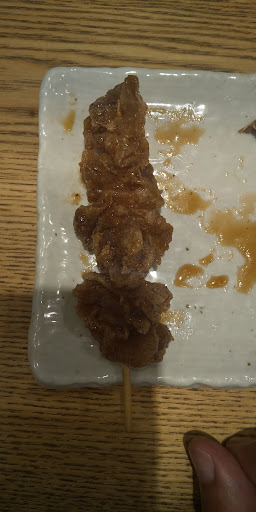 メニューを見るとビールが一杯190円、これはありがたい。 そして、名物という伝串と言うのは一本50円だそうな。 店員さんに何かと聞くと、鶏皮をパリパリになるまで揚げて味付けしたものだそうな。 それをまずは三本注文。 それと赤、赤というのは想像通り少し辛味のある味付けだそう。こちらは一本150円。併せて4本、あと揚げ時間が少しかかるのでスピードメニューを勧められる。 突き出しもある事だし、通常ならこう言ったものはあまり頼まないのだが安い。どれも大体200〜300円程度、だし巻き玉子をいただく。 しかし、空腹にビールを流し込んだせいか、出汁巻きにソースをかけてしまう。 朝食の玉子焼きに醤油かソースか?と言う命題は昔からあるが、どちらかと言うとソース派だ。 しかし、大根おろしは醤油に限る。そうっすね。