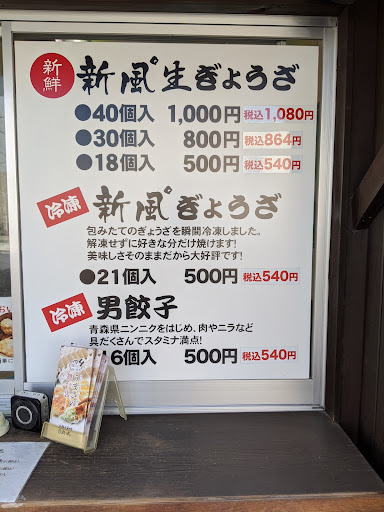 Read moreこの前土曜日の午後3時位⁉️に、バイクで初めて買いに行き、その時私は、ヘルニアで、コルセット巻いた状態で販売の直ぐ側に停めて私の前に先客が1人❗私の直ぐ後に車で来た叔母さんが来て私は腰痛で時間かかると思い先に譲って腰痛がってたら店の中から、店員の叔母さんが私の所まで、来て下さり、ご注文は⁉️と言われ注文したら私の所まで餃子持って来て下さり、その場でお金払い神対応で凄く助かりました。餃子はニンニク入りの生餃子とニンニク無しの生餃子とタレは1つ10円で、10個購入し多すぎてしまったが全部で2300円位で自宅で焼いて食べたら、大きく どちらも最高に美味しかった😋❗ニンニク入りの男餃子の方が個数は少し減るが、ムチャクチャ美味しいです✨もう、スーパーの餃子食べれない❗今迄食べた餃子で一番美味しいし、しかも安い💥✨新風餃子絶対にお勧めです✨外迄来て下さった神対応の店員さんもBRAVO✨コレからも買いに行かせて貰うので宜しくお願いします🙇安くて美味しい😋新風餃子💥❗是非食べて観て下さい...