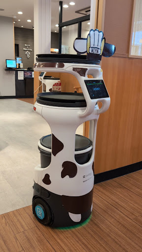 As an introduction I was born and raised in World renown Nebraska beef capital of the Midwest USA. I ordered the $1600 yen steak and veggies plate for lunch (before 4pm) Honestly I believe the highest price beef is more of what I was looking for. My steak was cooked perfectly and served sizzling hot on a thick cast iron platter with steaming hot veggies. The veggies were perfectly cooked as well slightly crunchy as I like them. I also ordered a side salad with sesame dressing. The salad was again perfect and was delivered to my table via the most amazing robot. Such a surprise! The robot sold me. I would visit again just to experience the robot service again! I keep waiting to video the robot but it was quiet and it is difficult to be ready to film. The robot talks and is so amusing. To my surprise the meal included all you can eat soup. Four different types, egg drop, beef curry, corn and potato soup. All the soups were spot on perfect. The beef was a bit of a disappointment but the wide variety of sauces made it more of a treat. The red sauce was my favorite but the brown meat sauce was a close second place. When I visit again I will splurge for the 2900yen steak. I think that is more like a ribeye. One can also order an all you can eat salad buffet. It was well under $10 USD...I think $4 usd? Kids eat free. There are also different options available such as a drink bar, salad bar, soup bar, something about alcohol but not sure. The place is spotless clean including the restrooms. Very comfortable booths to sit . Lots of free parking available. I'm the USA the beef was similar to sizzler. Not great quality but again I did order the lest expensive steak. That also have hamburger meatloaf type dishes. I was not a fan of the secret sauce but the red sauce I would...