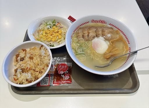 施設の共同駐車場が利用でき、店内はフードコート形式でテーブル席が並ぶ造り。 一部店舗のみでの限定販売だったこのメニュー、全店舗に展開となったので気になって食べてみた。 写真に温玉が入っていたのでスタッフに確し、それは抜きでの注文。 真っ先に味噌の香りが鼻を抜け、その味わいもコクがある濃いめの味噌。 麺は平打ちタイプで程良いコシがあるが、スガキヤでこのような麺を味わうのは変な感じ。 今回はネギトッピングなのでたっぷり入り、油揚げと蒲鉾も入っていた。 半熟が苦手な私にとって、そのような卵はトッピングメニューとしてもらえたら有り難いな...