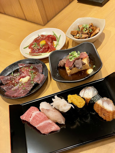 ♦️上まぐろ3貫盛り (980円) ♦️ 超豪華5貫盛り (2,068円) ♦️単品1貫 ◾生サーモン (176円) ◾えんがわ (176円) ◾いくら (330円) ◾数の子 (242円) ◾赤エビ (352円) ♦️まぐろユッケ (528円) ♦️自家製いくらバタートースト (528円) ♦️あおさ汁 (352円)