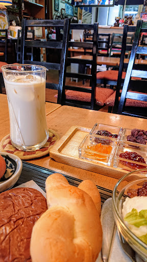 Read more和風喫茶。 定休日に通りかかり、翌日に訪ねてモーニングBセットを利用。ドリンクはほうじ茶ラテにしたので、+50円。ジャム4種を楽しめておいしかった。