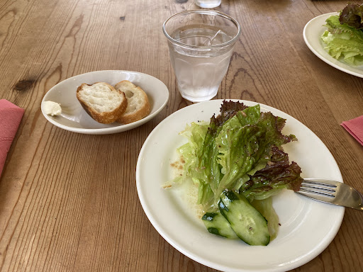 セットのパンは、とっても薄くスライスしたものが2枚。サラダは、レタスとキュウリがほんの少し。正直ガッカリするので、出さなくて良いと思います。
