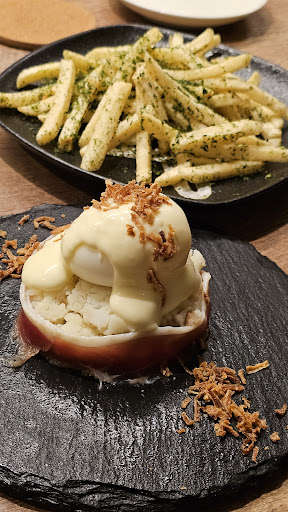 鴨のメンチカツは衣がサクサク! 牛よりもあっさりしているから 揚げてもくどさがないのが特徴でした🌟 卵黄を絡ませて濃厚さが加わるとまたおいしい。 のりしおフライドポテトはおつまみに最適!