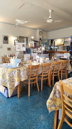 店内にはユーミンのポスターがあり、天井からカモメが吊るされていました。