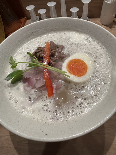 ☆注目すべきは6種の味変注射器💉☆ ふわふわの白濁スープがたまらなく美しい! 一口飲めば牛の旨みがじんわり広がり まるで韓国の本場ソルロンタンを ラーメンで味わえるかのような深みのある味わい😋 見た目濃厚そうだけど重すぎず 最後まで飲み干したくなる優しいスープです