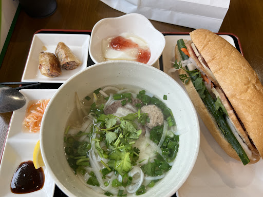バインミーは紅白なます、きゅうり、 ベトナムハム、豚か鶏のレバーパテ、 パクチーといったところです。 パンは外側パリパリで美味しく パテが少なめなので 初めて食べる方にはちょうど良いかも しれません。 味は美味しですが椅子が低いのか テーブルが高いのか食べ辛いです