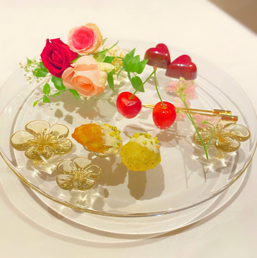 《食後の飲み物と小菓子》 プチフールののったガラスプレートも めちゃくちゃ素敵でキュン♡キュン♡します ハート型の赤いボンボンショコラは フランボワーズのチョコレート 中にはパッションフルーツのキャラメルも入って 甘酸っぱい初恋の味❤️ 流行りのピスタチオのマドレーヌ フレッシュなさくらんぼと バラの花も飾られて テンションが上がります コレを見てキュン♡キュン♡しない女子はいないハズ