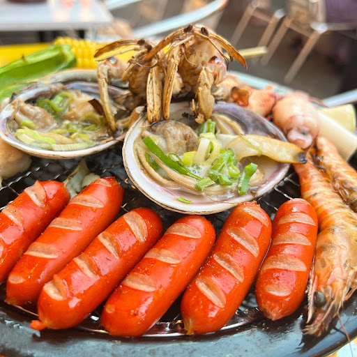 自動で注いでくれるビールの機械は優秀。 注ぐの楽しくて何回も笑 美味しそうな海鮮数種類とお肉など 好きなものをいろいろ持ってきて卓上BBQ...