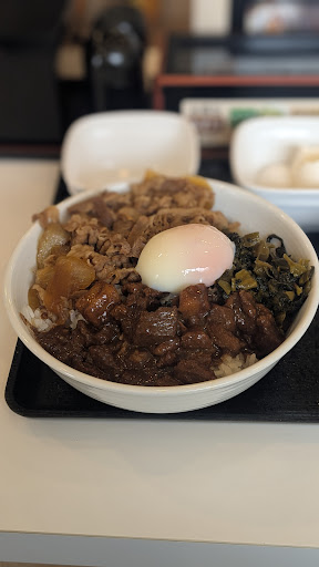 Read more疲れて夕ご飯の用意ができない時に、持ち帰りで利用しています。駐車場もあり便利です。 私が行く時は結構混んでいて駐車場待ちって時もあります。 店内で食事の方や持ち帰りのお客もたくさん並んでいてます。 店員さんはテキパキと店内を利用するお客に牛丼を提供したり、お弁当を販売にと大忙しです。 牛丼の他に豚丼、カルビ丼、カレー、季節限定、いろんな種類があって、どれも美味しそうなのですが、なぜか、毎度同じの牛丼の並プラス温泉たまごとお味噌汁、紅しょうが(無料)×3を注文してしまいます(*´`)🐂