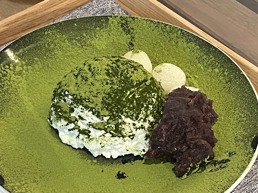 抹茶→ グリークヨーグルト専門店とは思えないほど和のスイーツも充実している。 見た目から涼やかな抹茶かき氷風スイーツ。 ふわっとした氷(またはヨーグルトベース)に、濃厚な宇治抹茶パウダーがたっぷり。甘すぎず、香り高い抹茶の風味がしっかり感じられます。 サイドにはもっちりとした白玉2個と、甘さ控えめの粒あんが添えられており、和の組み合わせがバランス良く味覚をくすぐります。緑の陶器皿と木のトレーの組み合わせも美しく、写真映えも抜群◎ グリークヨーグルトとの相性も良く、後味さっぱり。暑い季節はもちろん、通年食べたくなる一品です。