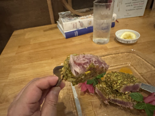 The rare tuna steak with pistachio was particularly impressive. Paired with orange sauce, mint, and marinated red onions, it beautifully captured the fusion of southern Italian and Okinawan flavors.