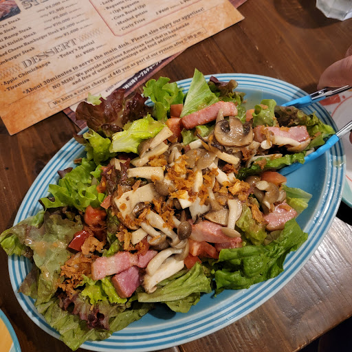 I feel like we found a hidden treasure! Maybe people are searching for authentic Okinawan food, but I have to say that the Ishigaki beef steak was so tender and flavorful. The house made onion dipping sauce was incredible and enhanced the flavor. My husband shared a bite with me. He also had the shrimp mac and cheese. It was really good too. We shared a salad that had sautéed bacon and mushrooms on it. I wasn't sure what to expect, but it was so good. I also had the Shrimp Ajillo. Very flavorful, I mopped up the butter sauce with the slices of baguette that came with it.