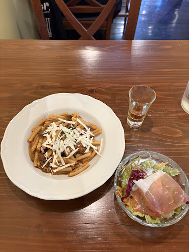 ボロネーゼ ですが、 この麺はなんというのだろうか ペンネよりも細くて 2本並んだ麺 この麺は ソースが絡んで 味わい深いし 麺の茹で加減が 好み