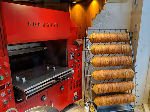 The store front shows a traditional oven and rack system that they use to bake the cake. The cake batter is applied to the metal rod and baked one layer at a time.