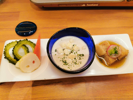 Read moreVery good shabu shabu shop (sign is that of 3 black pigs) showcasing best of Okinawan - beef / pork & local vegetables! Happened to chance upon this gem of a restaurant the night after typhoon passed (seems usually booked out in advance), which was stone's throw from Don Quijote and WBF Art Stay hotel. We ordered 2 sets (1 pork only / other is pork 4980yen + beef combo 6980yen). It comes with small trio of appetisers, pot of local vegetables, dessert, carbs at end (basically noodles added to leftover soup) and also split into 2 soup base in a pot (1 for pork 1 for beef). The meat came with portion of umibudo (sea grapes) on the side, and boy did it elevate the taste and texture of the already good meat (alongside yuzu kosho / ponzu sauce). English menu is available via ipad option, and there was a couple of staff with small command of English as well. Only 2 downside here was we were told we can't order 1 set to share (had to order 2 for 2 pax), but i feel it could have been a miscomm, and other was they didn't quite explain where each different cut of meat came from (we saw different name tags on meat portions). It was so good we tried to go for dinner again on our final night, but they were already booked out then. A high recommendation, if only just for the local vege showcase (since other restaurants also has usual beef /...