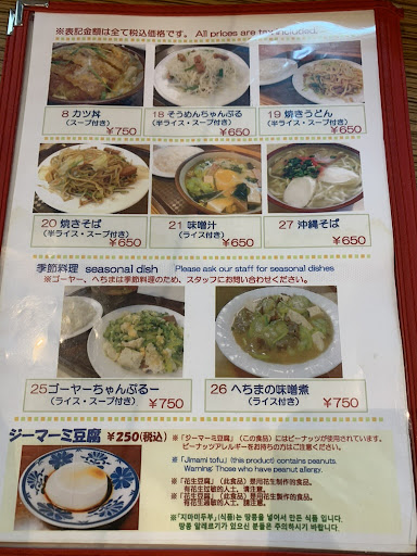 This restaurant is run by many aunties. That's when you know that you can get a true local flavor of Okinawan cuisine here. The food is simple, unadorned, down-to-earth yet filling. Well, the shop's champon did not meet my expectation since I expect more meat. However, the Goya Champuru is perfect for me. The bitter melon, eggs and spam come together so well. There are also many other meaty dishes there that looks so good like stirred fried ginger pork or garlic beef. However, I can't eat anymore after two big portioned dishes. Each dish is less than 1,000 yen! This is really the restaurant for customers. I would definitely love to...