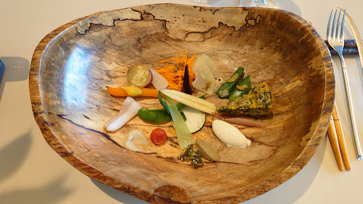 ① アミューズ(開胃小點) エクレア(閃電泡芙) 今帰仁アグー(今歸仁阿古豬) 雖直譯是閃電泡芙,但其實外觀跟味道都不太一樣,是鹹食。裡面包著剁碎豬肉內餡,外皮有點像是千層酥的口感,上方為宮古島博荷葉,加上碎番茄和甜椒,開胃的輕食,但味道一般。
