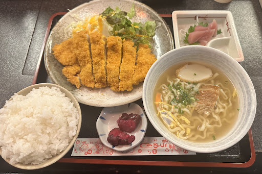 As for the diner menu The menu includes a variety of Okinawan dishes such as champuru, pork cutlet, chicken cutlet, curry, etc. Most of the dishes come with Okinawa soba or sashimi, and at this price, it may be my personal No. 1 diner in Naha. It is hard to decide between Mikasa and this restaurant. I ordered the signature chicken cutlet that day and the pork cutlet the next day. The batter is crispy and juicy inside, and it comes with Okinawan soba noodles and sashimi! This pattern of Okinawan soba is not that great, but the soba here is also very tasty. One negative is that smoking is allowed, which is not nice for non-smokers. Also, parking is a problem.