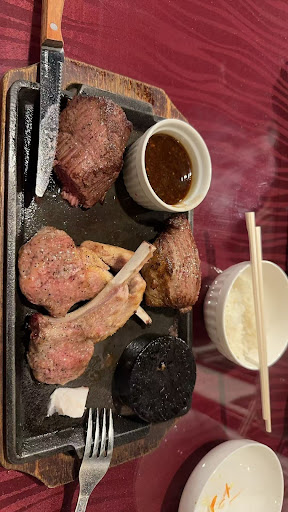 Read moreI had a steak craving and this place really hit the spot. Their ribeye steak was tender, juicy, fatty without being too fatty and the meat was really tasty! It comes out already seared and cooked, but if you prefer your steak other than medium rare, you can cook it yourself on the tiny hot stone on your plate. They provide a bit of beef fat to cook it in tooanf if needed they swap the hot stones to give you a fresh one that's piping hit. There are 3 sauces to choose from and I had the red wine sauce. It was rich, flavorful, not too salty and it went really well with the steak. Also, there is a small buffet you where you can make a small salad, get some white rice or a bowl of beef tendon broth. The salad was nice, thinly scredded cabbage and carrot and some seaweed with onion dressing. The beef broth was rich, lots of flavor. Lots of beef and onion. It was a great meal! Staff was friendly and you can pay by card....