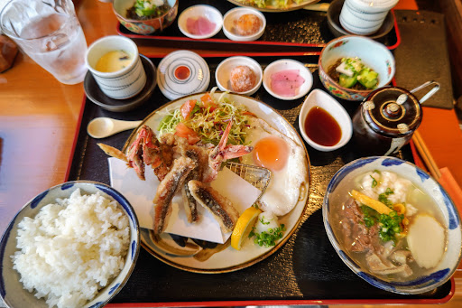 This is by far my most favorite meal I had in Okinawa, if not Japan, in this 2023 trip. I was blown away by the taste and quality of the dishes. I got a lunch set packed with various dishes: chirashi don, mixed sticky rice, unadon, tendon, okinawa soba, some side dishes, and a piece of warabimochi. What amazed me is that each dish is beautifully arranged and freshly made. An example would be the unadon, it is warm and delicate, with a smell of charcoal burnt marks. Another example is the okinawa soba. There are many little details of the braised pork, egg strips and fish cakes that make the dish beautifully, satisfying, yet clean. I might need to write an essay to praise everything. And the crazy part. It costs about 12 dollars! I highly recommend anyone to come and try by yourself. I will definitely come back to eat here again. I would like to try their dinner...