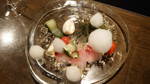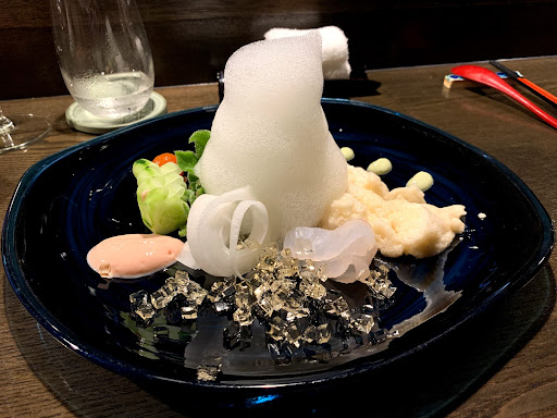 外觀很特別,泡沫不是裝飾品,而是有醬料的一部分。泡沫品嘗是香檬(シークァーサー)的風味,吃起來口感很特別,會瞬間在嘴裡化開。海葡萄有先鹽味調過,旁邊是點綴像是寶石般閃閃發亮的凍類是「乃し梅(梅酒)的梅酒風味凍。