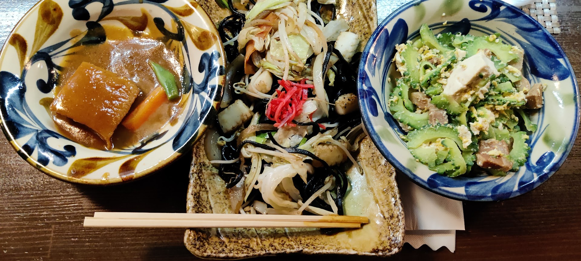 I personally had the Goya Campuru (bitter melon with egg and tofu), Rafute (2 pieces of pork belly in some sort of sauce), and the Ika-yaki (Squid ink yakisoba noodles).