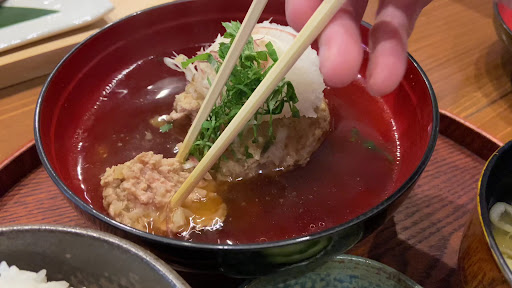 お店の定番メニュー「出汁ハンバーグ」(1,280円)をいただきました。お盆に並ぶのは、お新香、味噌汁、ご飯、そして出汁ハンバーグ。シンプルでありながら、美しい和の料理です。スタッフからは「出汁にハンバーグを崩しながら召し上がってください」とのアドバイスがありました。一口食べてみると、和風のお出汁に紫蘇と茗荷の香りがふわりと漂い、ハンバーグが出汁をたっぷりと吸い込み、肉の甘みと和の香りが見事に調和していて、とても美味しかったです。ご飯の量も程よく、ちょうどお腹八分目くらいで食べ終えることができました。