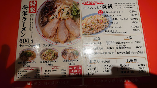マークやフォントは当時のまま。店内に入ってみると店員さんの元気な掛け声。少し違和感。 空いてる席へ、と言われたので空いてるカウンターに座る。メニューを見るとイチオシは特製将軍ラーメンのようで一番大きく載っている。野菜炒めが載っててまたも違和感。 将軍の味を求めて来たので初代長浜ラーメンを注文。この時点でお冷はまだ来ていない。店内はそこまで忙しそうには見えない。 トイレに行きたかったのでトイレに行って戻ってくると最初に座っていたところに後から来られた方が座っている。店員さんからは「席をかわられたんですか?」との声。お冷が来てなかったからですよと応対する。 その後お冷が来てラーメンもくる。こんな感じだったかな?と違和感を持ちつつ麺を啜ってみるがやはり違う。 とても塩辛い。スープがコクがあるというより塩気が強い。チャーシューも薄く、長浜ラーメンという体はなしているが全く初代長浜将軍という味ではない。もはや別物。 いつも替え玉を行うがそんな気にもなれず人生2度目の替え玉なしでの退店。