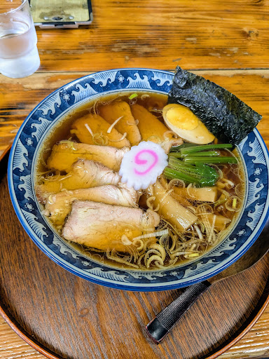 水曜日、おばちゃんの暖簾掛けと営業中の看板掛け、開店と同時に入店。先客なし😅 ネギみそラーメン800円、チャーシューメン850円(大盛150円)、ギョウザ400円。 しばし待つこと13分最初はギョウザが到着。小さいけど、餡の野菜が美味しく、食べきってしまうのが勿体無く、チビチビ食べます。 16分でネギみそラーメン着(息子が食べたので私の味見はなし)。18分で私のチャーシューメン着。麺はピロピロですが、手打ちじゃないのか、伸びているのか、とってもやわやわ。固めをオーダーした方がいいかも。 具はネギ、チャーシュー8枚(モモ)、メンマ(水煮)、ほうれんそう、ナルト🍥、醤油味の味玉🥚。 白河らしく縁ピンクの脂ほぼなしのモモチャーシュー。 スープはあっさりでしたが、完食するにはベスト。
