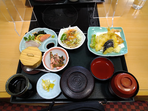 2022.7 コロナの影響があるのかもと思ったけど、いつもお昼はお客さんが多い印象なのですが訪れた日は全然、駐車場も開いてて店内も席に余裕有りで周りを気にせず、ゆっくり食事出来ました☆ 席に着くと、そこに マスクケース☆ 自分が着けてるマスクを保管するためのマスクケースが置いてありました☆ ちゃんとしてるなって感じるサービスです☆ 今回オーダーしたのは夏の特別メニューさんぞくや名物定食☆ 茄子などの野菜と豆腐の揚げ出し、唐揚げ、鮭や昆布の入ったおにぎり、お味噌汁、茶碗蒸しに小鉢☆ お腹いっぱいになりました☆ 親と一緒に行って親は天ぷら定食頼んでたけど、こちらもボリュームは満点☆ 接客も良いです...