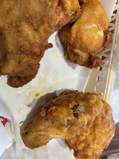 17時ちょっと早めのディナーで入店。 店内のお客はゼロ。フィレサンドと和風カツ、オリジナルチキンを4本とドリンク、食べたいが食べれそうにないのでお持ち帰りでビスケット2個注文。支払いを終えたらほぼ同時にお持ち帰りも全部出てきた。残念作り置きかーと思いつつ着席。開いてみると思った以上に酷い。チキンはカリカリ感はもちろん無し。油まみれで下に油が溜まってしまう始末。ポテトも温めてあるからか周りはほんのり暖かいが中は冷たくなっている物もあり。 自分も悪いが見落としていたのでショーケースを確認、隙間ないほど揚げ置き、何処もこのシステムなのか。 家のフライヤーで上げ直した方がマシと思いビスケットぬ袋に無理やり詰めバーガー類だけ食べて退店。 何処もこんな感じならケンタッキーはもうないかな。とりあえずこの店はもう行かないです。 チキンのベチョベチョ...