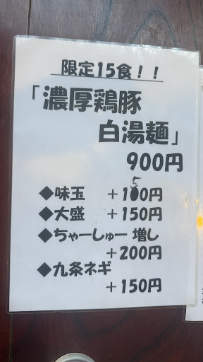 らーめんダイニング 庵に到着 11時半近くに着いたのだがまだ開店前、丁度お店の人が出てきたので聞いたら11時半開店ということだった。外で少し待って入店 座敷に通された。 メニューを見ると 限定15食!! 「濃厚鶏豚白湯麵」900円「濃厚煮干しらーめん」塩or醤油)950円 安定の旨さ!!丸鶏中菜そば 醤油or塩950円 ◆味玉+100円 大盛+150円◆ちゃーしゅー増し+200円◆九条ネギ+150円