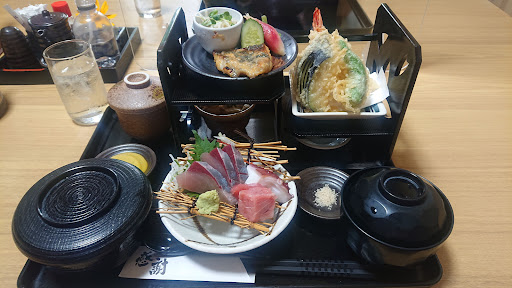 能登へ行く途中でお昼ご飯を食べようと別の所にまず行ったが満員&受付終了で、ネットで調べて見たところ口コミで評価が高かった為、七尾から戻って行きました。 13時半過ぎのためか、あまり駐車場には車がなく、中に入っていくと3~4グループくらいしかいませんでした。奥の座敷に通してもらい、あづま御膳と海鮮丼(+5種類)を注文。 提供時間は早くはないけれど、15〜20分ほど待っていた気がします。 ですが、運ばれてきたお料理を見てびっくり!これは時間もかかりますね(笑) あづま御膳は厚切りお刺身3種、さくさくの天ぷら5種ほど、手作り?のようなお豆腐、茶碗蒸し、焼き魚(鯖)、小鉢(そーめん)、味噌汁とたくさんのお料理が(^^♪ 海鮮丼も+800円でさらに豪華になっていました。 お刺身はとても新鮮で、マグロは甘くてすごく気に入りました(^...