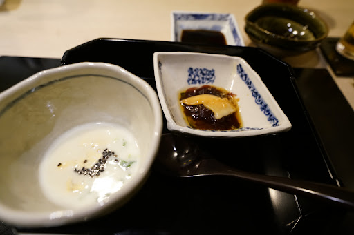 ・大分の車海老、じゅんさい、ごまどうふ、しいたけ 車海老ははしっかり甘く、旨味が後まで残ります。ごま豆腐はまったり優しい味わい。