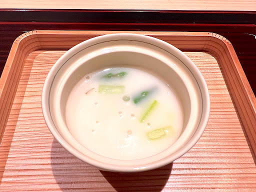 ・鱧の御椀、大根 出汁がすごく美味しい!深みがあって良い香りが追いかけてくる。まぐろ節と、利尻、羅臼の昆布を使われているとのこと。 鱧の上品な味わいにこの出汁がよく合う。ふわりとした口溶けです。