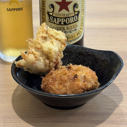 ワタクシのお目当てはそのちょい飲みセット、それで軽く一杯やっていくことに。ちょい飲みセットはクリームコロッケ+ポテトフライ、塩からあげ+ポテトフライ、鶏天+メンチカツの3種類に瓶ビールなどのドリンクが付いて税抜き1000円、その中から鶏天+メンチカツをチョイス、ホントはロースカツも食べたかったのですが単品にはロースカツはなかったので串カツも追加でいただくことに。