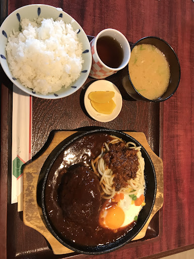 私はハンバーグ定食を注文しました。 鉄板にのせて出されてきたハンバーグは自家製だそうで、肉の旨味と玉ねぎの甘みがしっかりと感じられ、とても美味しかったです。
