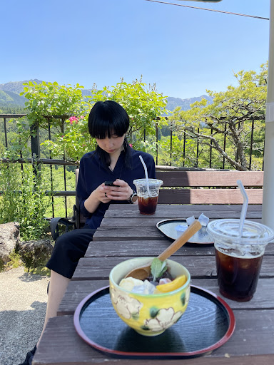 We sat on the terrace for a small coffee break and had some iced coffee as well as some traditional Japanese dessert (sorry, not entire sure what it was called). While there was an occasional strong gust of wind, we could enjoy the Mountain View and the sun on the terrace, and we folded out the parasol when it got too hot. Small souvenir shop inside as well. One of the quieter cafes in Magomejuku due to the outdoor...