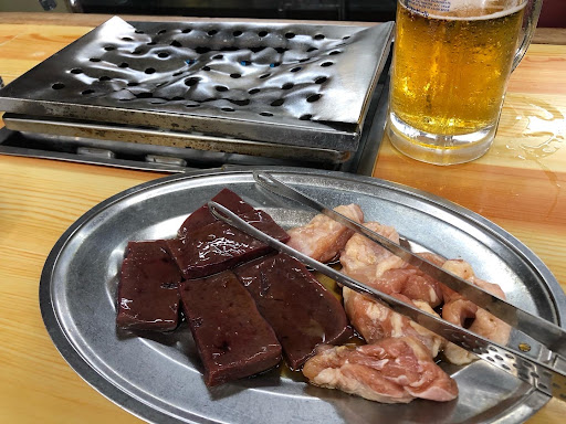 テーブル席の電気が消してありましたので、お昼時はおまけの営業なのでしょうか。カウンター席には焼肉台のような器具が備えてあります。