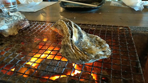 テーブルのグリルに熱く燃えた炭を入れ、すぐに牡蠣を載せる。 トングや手袋もついてきたので安心。 数分でグツグツしてきて牡蠣を開けてみると、いい感じに火が通ってる。