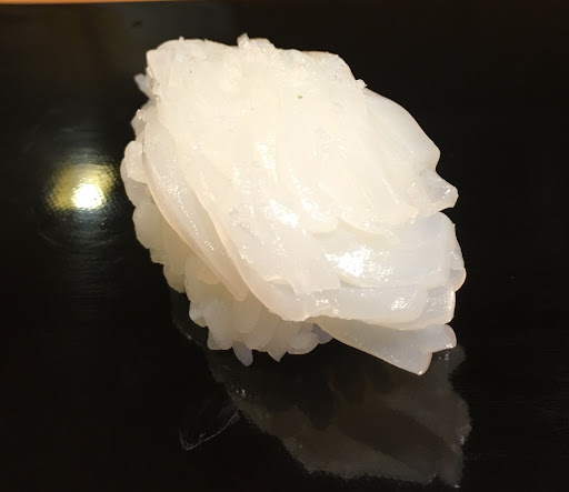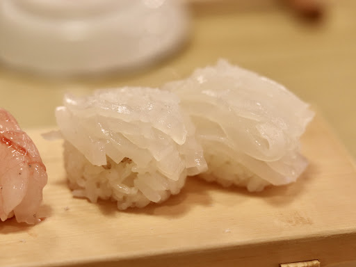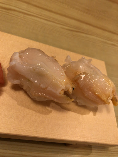 マイカ 海塩の旨味と相まった歯ごたえ良し 真鯛の昆布締め 柚子の風味もよくややねっとりと旨味しっかり アラ 海塩と柚子とバランスもくあっさりで歯ごたえよし フクラギ 鰤の体長30~40cmの幼魚、飾り包丁も美しく醤油のバランスよい絶品 甘海老 プリプリというよりブリブリでねっとりした旨味 白エビ 富山湾の宝石を美しくにぎった逸品