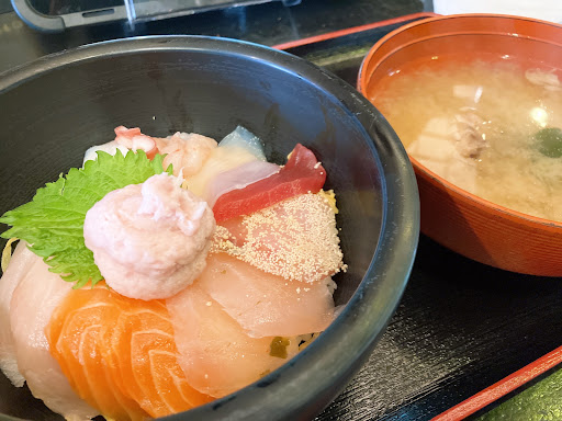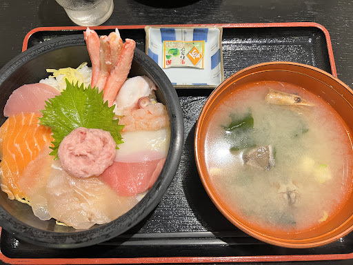 海鮮丼:3/10(どこでも食べられるレベル) 焼き魚:2/10(提供に時間がかかりすぎな上脂が凄すぎて半分位い残していた) エビフライ:8/10(美味しかった) 味噌汁:3/10(コクが無い。海老の頭などを均等に配分し味噌汁を注いだと思われる。全員の具材が寸分たがわず一緒だった)