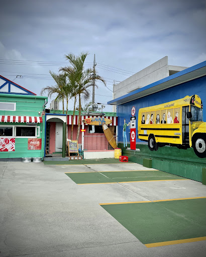 今まで沖縄で中部方向ばかりで遊んでいたので、今回初めて南部へ行ってみようということで、食べログ評価が高い絶景カフェを目指して走っていると、途中、田舎道に突如、アメリカの星条旗、エルビスやマリリンモンロー等描かれたド派手な建物が出現。