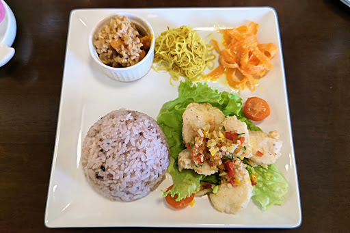 前々から行ってみたいと思っていたカフェ「icoi」さん。旧玉城村の前川にある素敵なお店です。 nobuta夫婦は、南城市方面に行くのが日曜日・・という場合が多く、日曜日お休みの「icoi」さんに縁がなかったんですよね。 この日は、グスクロード公園でイベントがあって、土曜日に立ち寄った帰り道に「icoi」さんに電話予約してランチで立ち寄りました。 正午、オープンのお店で夕方5時までの5時間が営業時間。日月がお休みです。 店内に初めて入りましたが、外観から感じるよりもはるかに広いお店で、席数を抑えているので解放的な空間となっています。 また、お店の1/4は雑貨屋さんとなっています。 テーブルから椅子まで凝っているので、寛いでカフェタイムを楽しむことができます。 ランチメニューは、週替わりで ランチプレートドリンクセット グルテンフリーパスタドリンクセット がともに1,320円。 ビーガンのブッタボウルドリンクセットが1,265円となっています。 ドリンクは、珈琲、ダージリンティー、ソイラテで、+αでいろいろなドリンクが堪能できます。 デザートは別途購入する必要があり、 キャロットケーキ 300円 抹茶のビーガンタルト 400円 チーズケーキ 450円 がありました(もちろんビーガンです)。 nobuta夫婦は、ランチプレート(ソイラテ付き)を注文。 出てきたプレートが最初の写真になります。 アップがこちら。 メインは鶏むね肉の香味ソースで、他に かぼちゃの大豆ミート和風あんかけ 人参とオレンジのサラダ 大根ときのこのバター醤油ソテー きのこのすまし汁 です。どれも美味しいですよ! そしてソイラテのビジュアルがこちら。