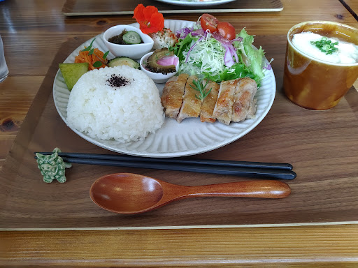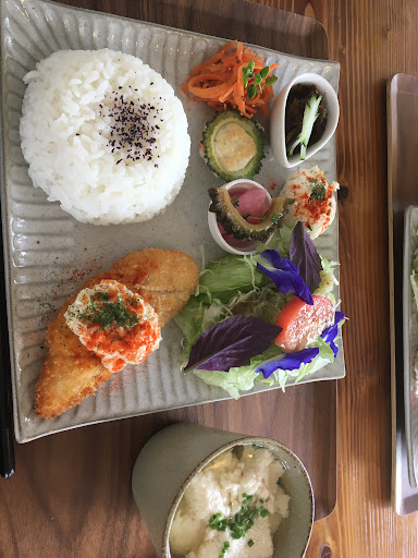 大里城址公園近くの小さなカフェ。 日替わりランチはいつも全てが美味しく、料理が色鮮やかで目にも嬉しい。野菜たっぷりでヘルシーなのに満足度満点のランチでコスパ最高。ランチは持ち帰りのお弁当でも買え、そちらもコスパ満点。 店内は狭いので絶対に席が欲しければ予...